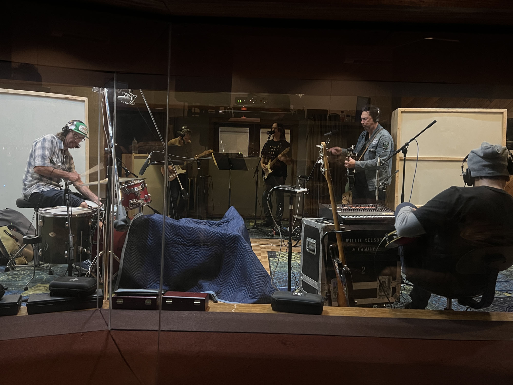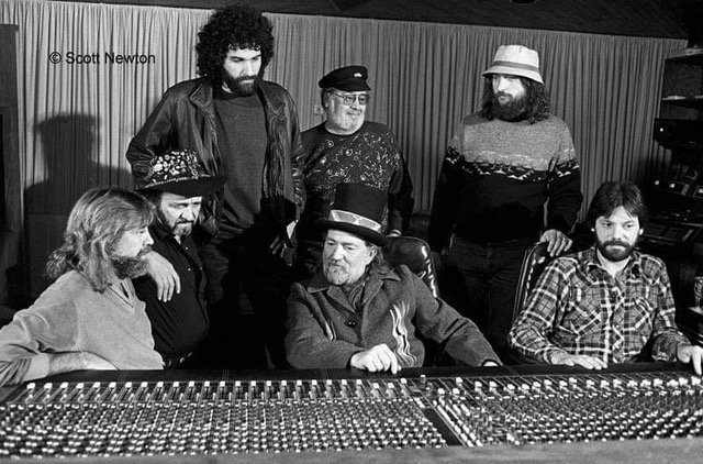 1981 or 82, Tougher Than Leather sessions. L to R: Jodie Payne, Waylon Jennings, Mickey Raphael, Grady Martin, Bee Spears, Larry Greenhill.